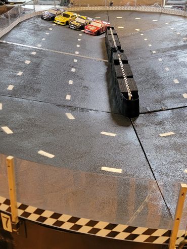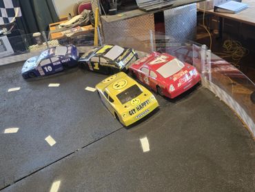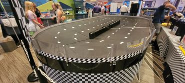 Our 8' x 16' track works amazing for indoor events such as trade shows, school events and corporate gatherings. We typically run 4 cars per race on this setup.